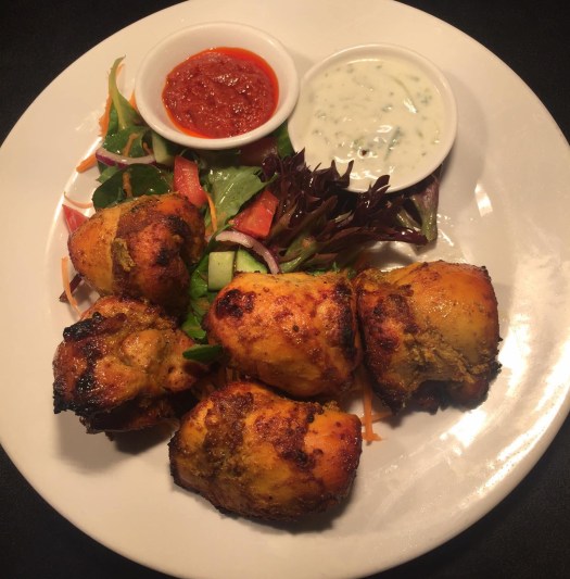 | Tender chicken pieces marinated with yoghurt a little ginger and garlic, cooked in the clay oven and served on a bed of salad accompanied with raita and hot tomato achar. | |
